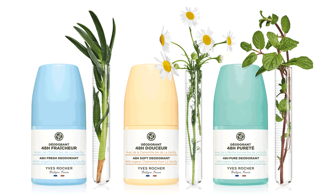 Yves Rocher tilbyder også en række friske hygiejneprodukter. Vores seneste lancering er nye naturlige deodoranter, der indeholder pudder af bøgetræ. Ingrediensen er valgt for dens evne til at absorbere kroppens sved. Deodoranten fås i tre dufte og indeholder økologiske aktive ingredienser, der dyrkes i La Gacilly, og formlerne har mere end 96 % ingredienser af naturlig oprindelse. Deodoranterne beskytter mod dårlig lugt i hele 48 timer. De er desuden fri for aluminiumsalte og alkohol. Kamille, middagsblomst eller pebermynte, valget er dit. Hvad sker der så senere på efteråret, når det gælder skønhedsprodukter?